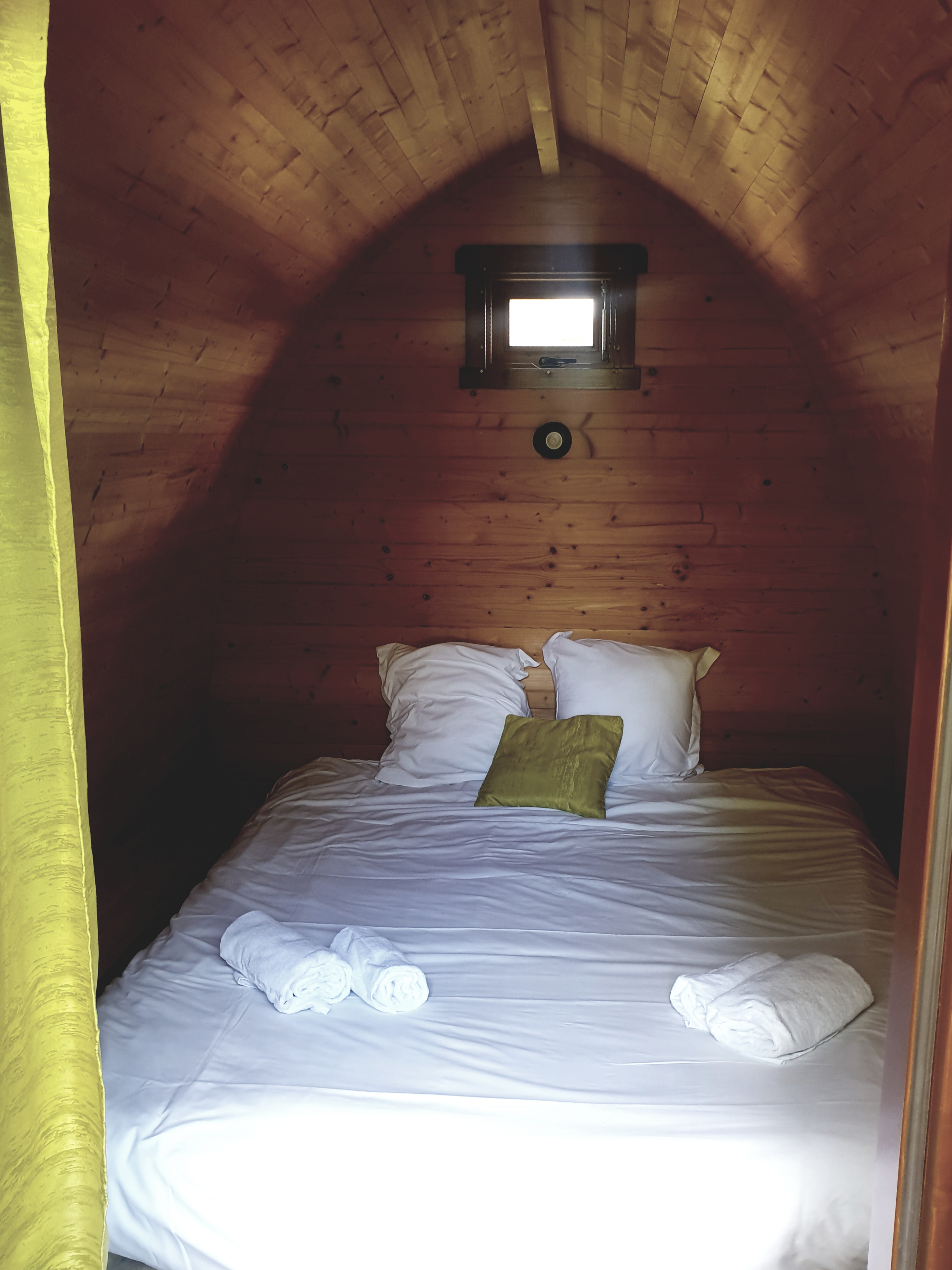 C’est dans un pod, un petit cocon hors du temps, que nous avons passé la nuit. Comme nous vous le disions plus haut, cet hébergement est né au Royaume-Uni et s’inspire des cabanes de bergers anglais. Apercevant cette forme atypique, nous sommes comme retombés en enfance, âge où les cabanes dans les bois nous passionnent…