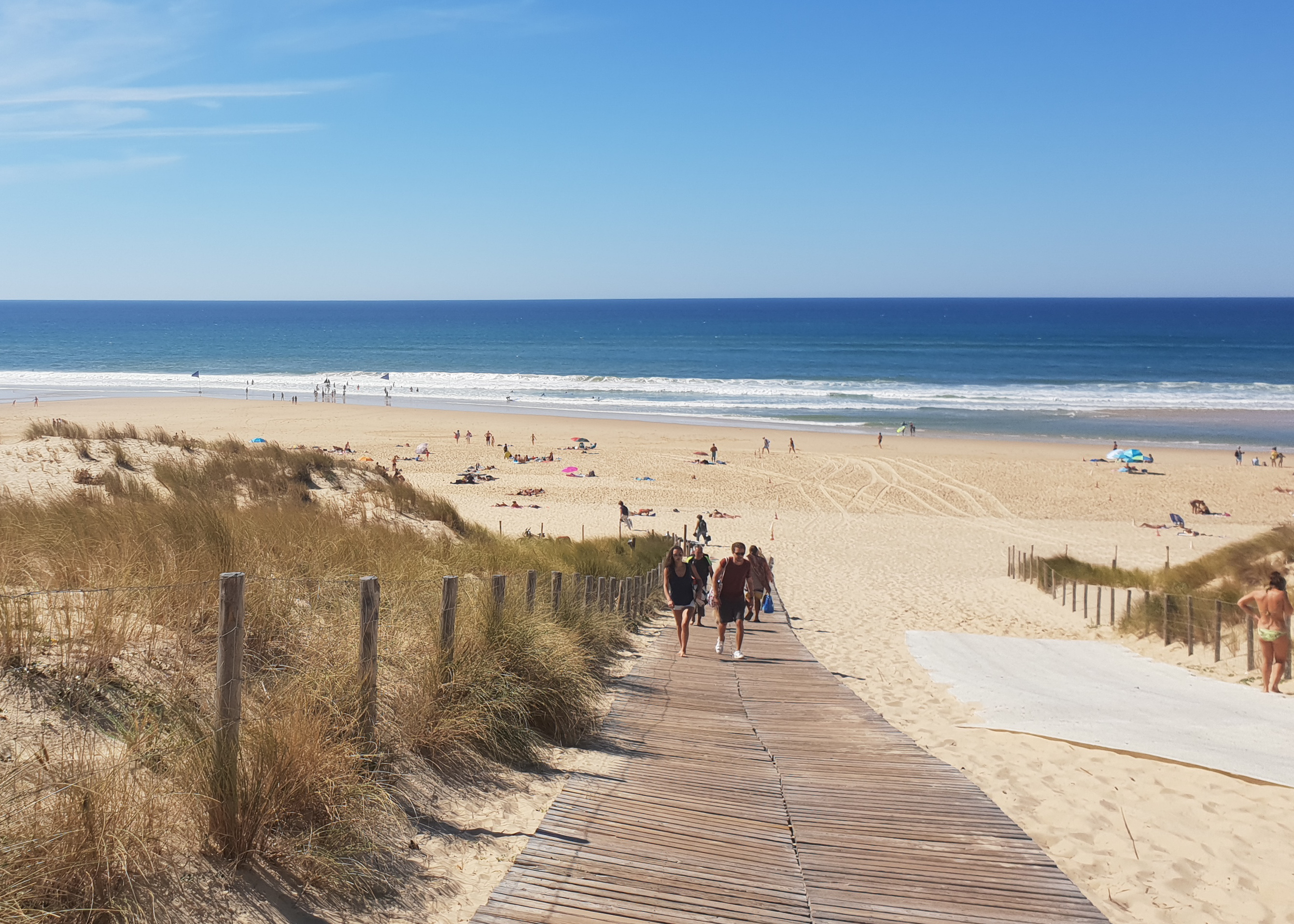 Après avoir longé en voiture l’incroyable réserve naturelle des Prés Salés, à cheval sur les communes d’Arès et de Lège-Cap Ferret, nous faisons un arrêt rafraîchissant sur la plage du Truc Vert. Enclavée dans la forêt domaniale du Cap Ferret, la nature est omniprésente de la route aux parkings aménagés. Les quelques minutes nous menant à la plage sont enchanteresses. Nous marchons sur des caillebotis ensablés, entourés par des sous-bois ombragés par les pins, au rythme du chant des cigales. La plage fait son apparition sous nos commentaires admiratifs. L’immensité de sable blanc qui s’entremêle à l’horizon, les vagues déchainées de l’océan, on est bien loin de nos petites criques méditerranéennes. Excités comme des enfants, je foule le sable fin à la recherche de coquillage pendant que Dorian joue à saute-mouton avec les vagues.